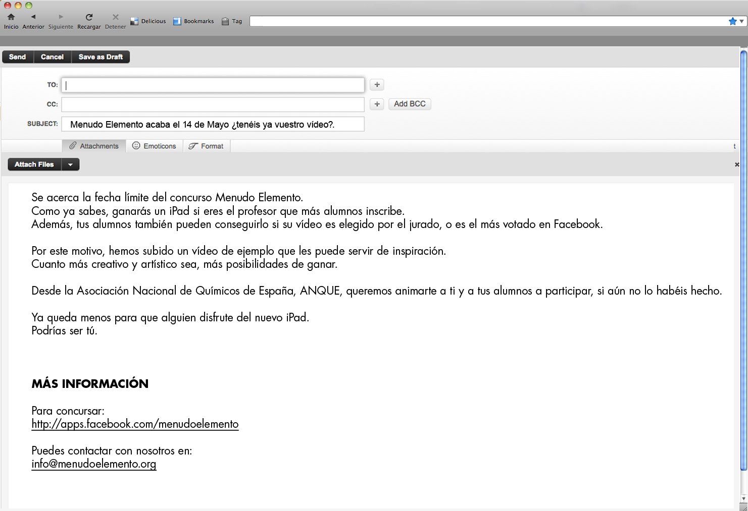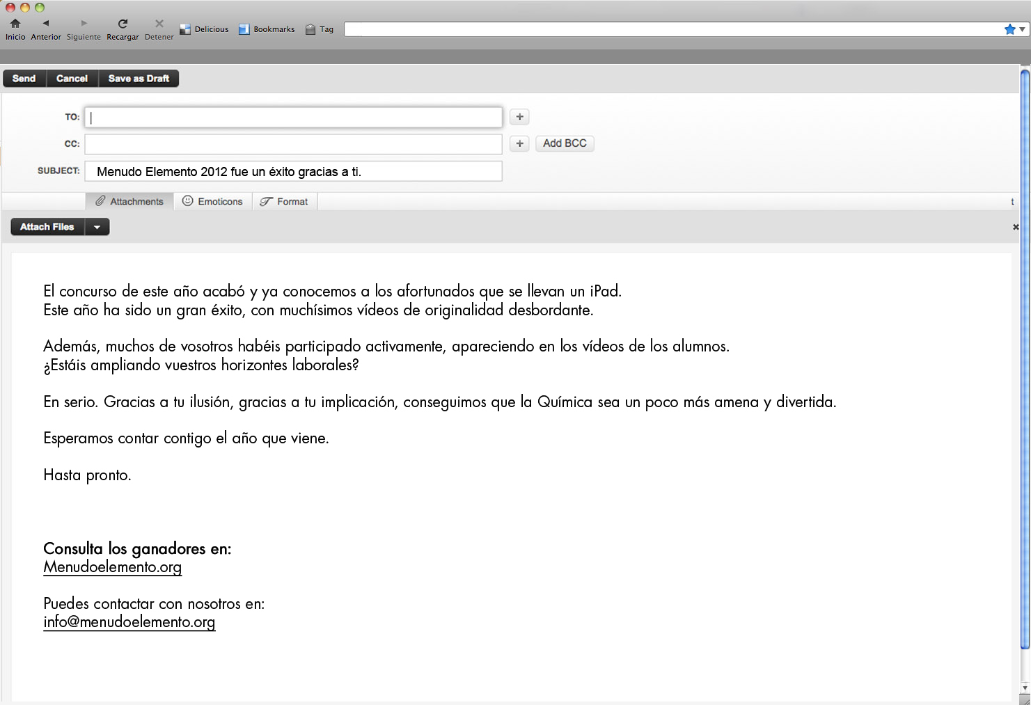 El objetivo es conseguir que los jóvenes vean la asignatura de química con otros ojos. ¿Por qué tiene que ser aburrida? Hagamos que se involucren, representen y graben algún concepto químico de la manera más creativa que se les ocurra. Sin trabas. Contamos con unos magníficos prescriptores; sus profesores de bachillerato. Menudo Elemento es un concurso que utiliza las principales redes sociales. En 2012 conseguimos aumentar: